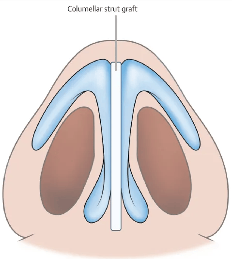 Lack of tip support after a primary rhinoplasty is a common problem leading to an unaesthetic tip without the classic supratip break. Adding additional tip support with cartilage grafts is a common procedure in revision rhinoplasty. These include columellar strut grafts and septal extension grafts. They may have been used initially but were not large enough or supported enough to give the tip the support needed for a pleasing result.